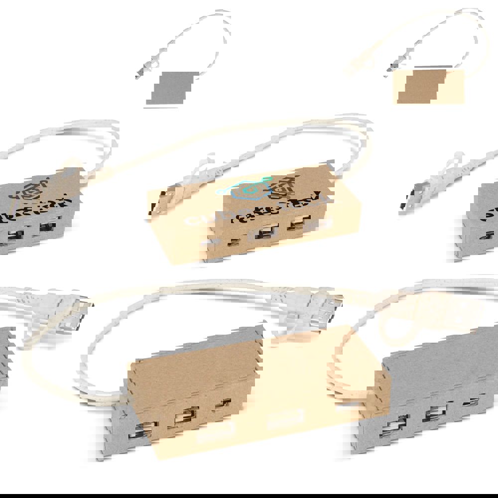 Hub gemaakt van gerecycled papier met dubbele ingang (USB & Type-c) en 2x USB-A + 1x USB-C poort. Groene innovatie voor je werkplek.