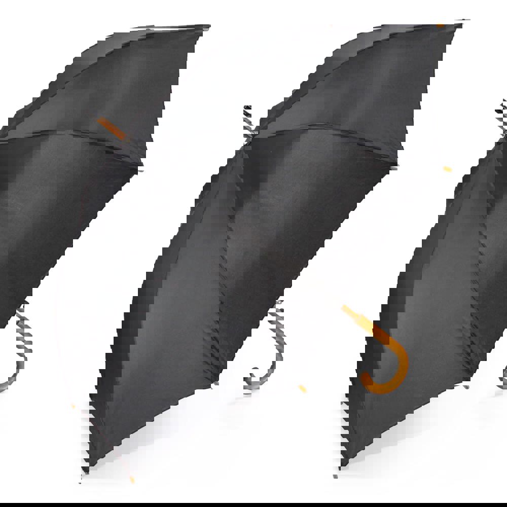 Deze 23"" stokparaplu heeft een houten haakhandvat en een stevige houten steel met een fiberglas frame, ontworpen om hevige regen te weerstaan. Voorzien van automatische opening en handmatige sluiting, met een duurzaam 190T polyester doek dat zorgt voor betrouwbare prestaties.