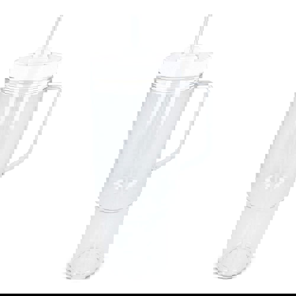 De Miami beker is een trendy isoleerbeker met een inhoud van 1,2 liter. De mok is gemaakt van R-PET-materiaal, heeft een handvat en een rietje.