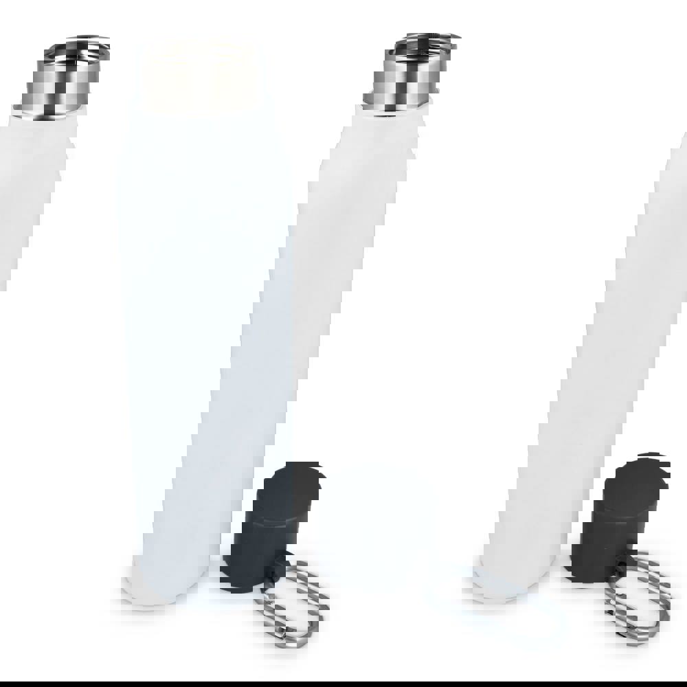 Stevige thermosfles van 600 ml met matte afwerking. De dop heeft een karabijnhaak om hem aan je tas te bevestigen en gemakkelijk mee te nemen. Per stuk verpakt in een giftbox.