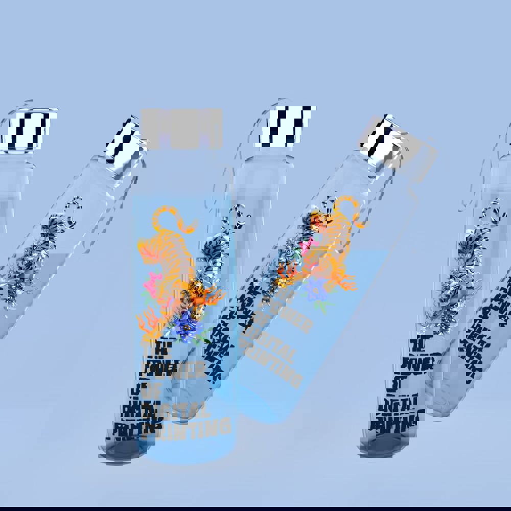 De glazen waterfles bevat een bandje aan de dop voor het eenvoudig vasthouden van de fles. Geschikt voor koude, koolzuurhoudende en niet-koolzuurhoudende dranken. Wordt geleverd in een geschenkverpakking.