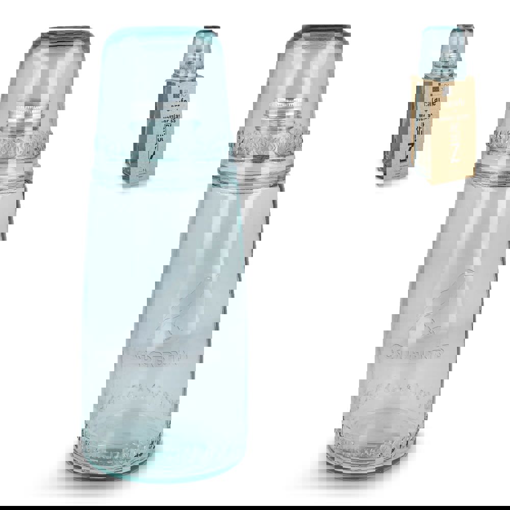 Glazen waterfles met sleeve. De fles zorgt er voor dat dranken langer koel blijven door middel van de sleeve er om heen. Inclusief een bandje aan de dop voor het eenvoudig vasthouden van de fles. Geschikt voor koude, koolzuurhoudende en niet-koolzuurhoudende dranken. Wordt verpakt in geschenkverpakking.