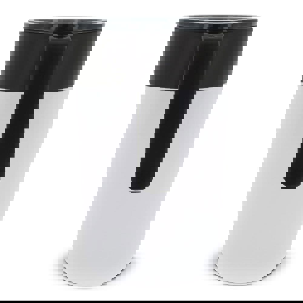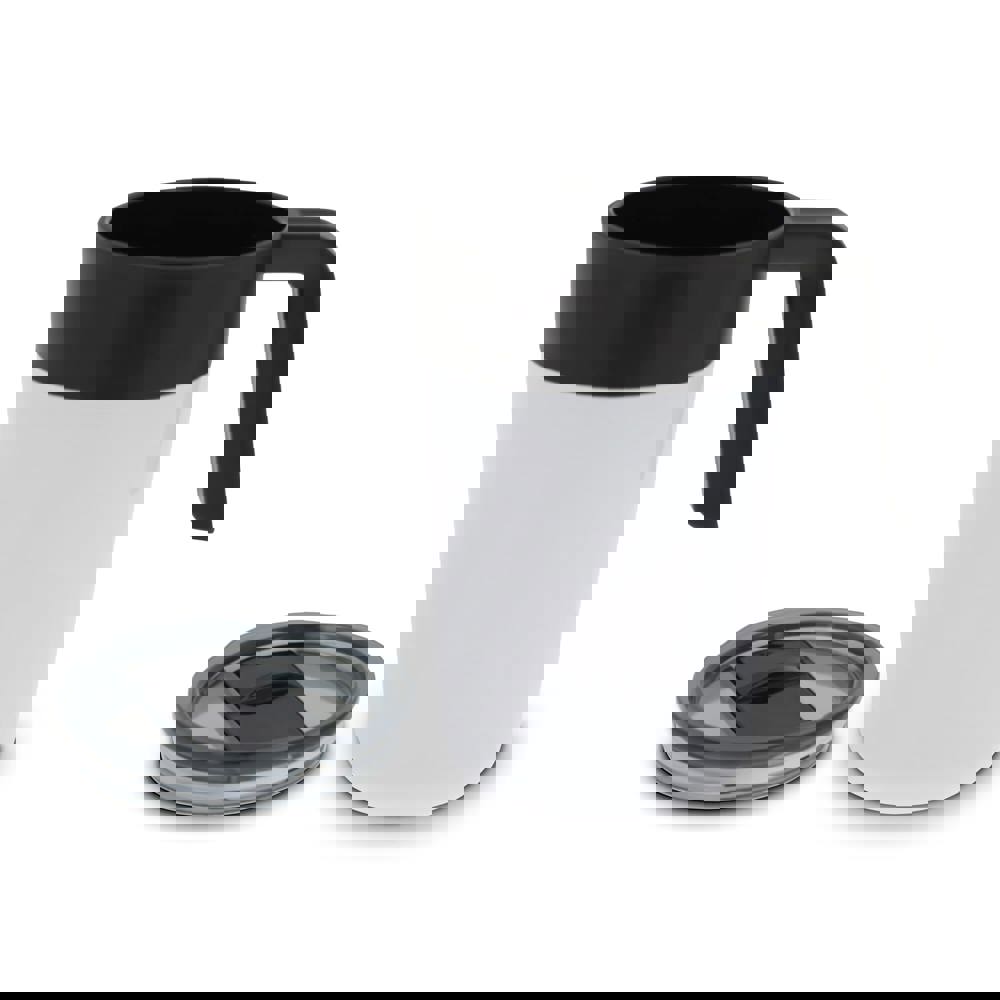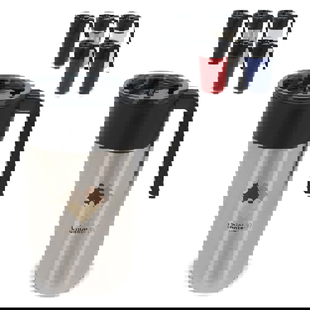 Dubbelwandige koffiebeker met deksel. Roestvrijstaal aan de buitenkant en PP aan de binnenkant. Dit model houdt koffie/thee langer warm door de dubbelwandigheid en de afsluitbare deksel met drinkopening. Wordt geleverd in een geschenkverpakking.