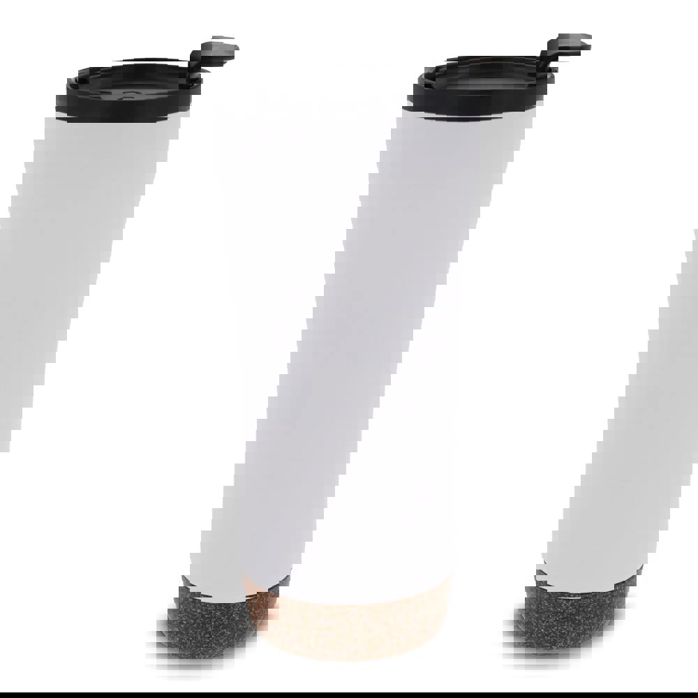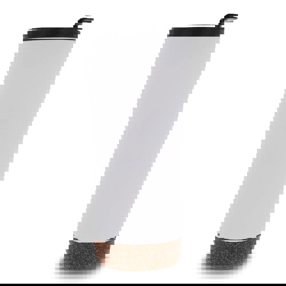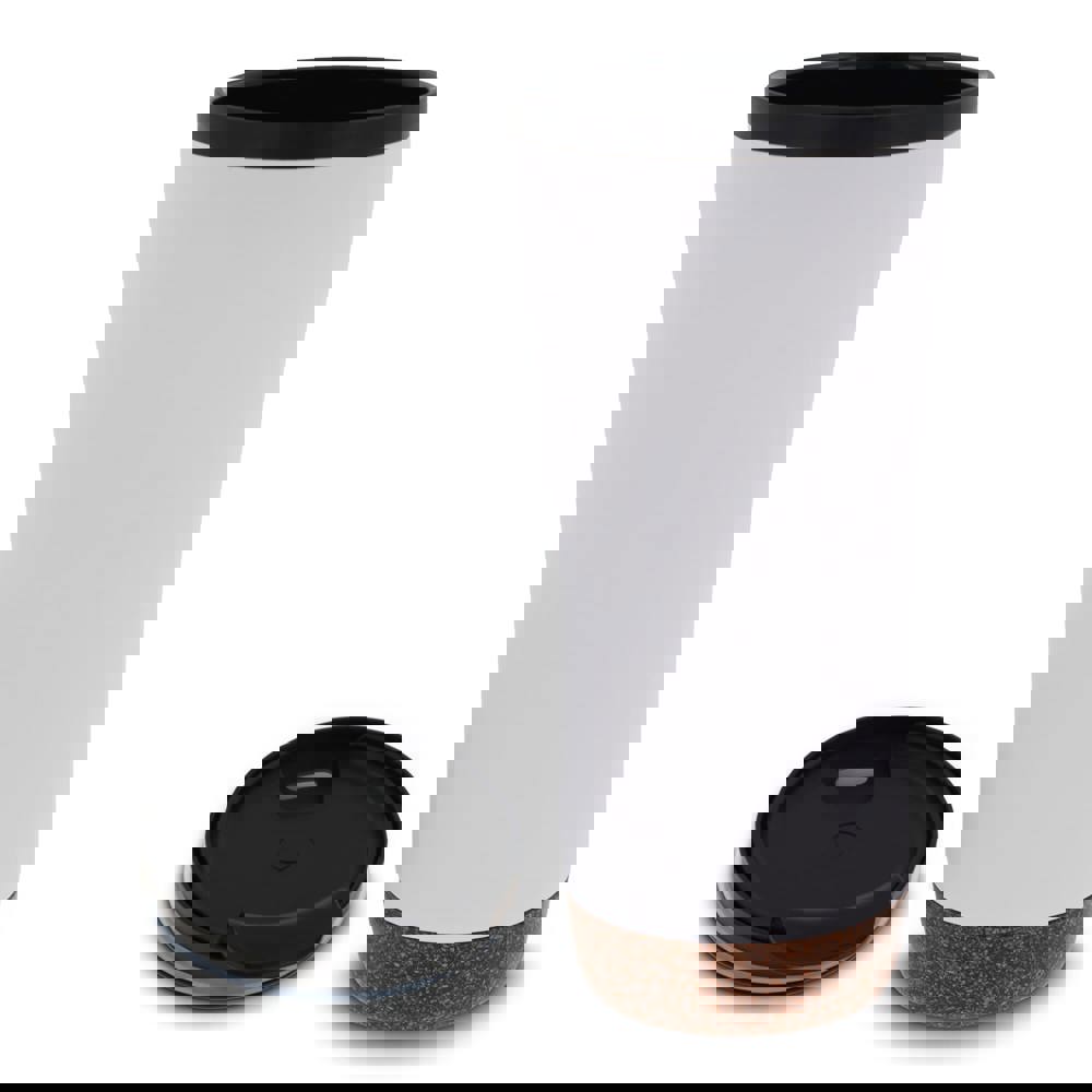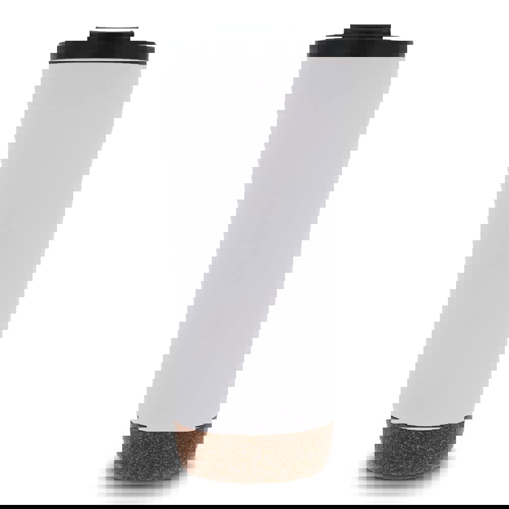 Dubbelwandige koffie beker met deksel. Roestvrijstaal aan de buitenkant en PP aan de binnenkant. Dit model houdt koffie/thee langer warm door de dubbelwandigheid en de afsluitbare deksel met drinkopening. De onderkant is gemaakt van kurk wat er voor zorgt dat de onderkant niet krast en het voorkomt koffiekringen op de tafel van koffie die langs de fles druppelt. Wordt geleverd in een geschenkverpakking.