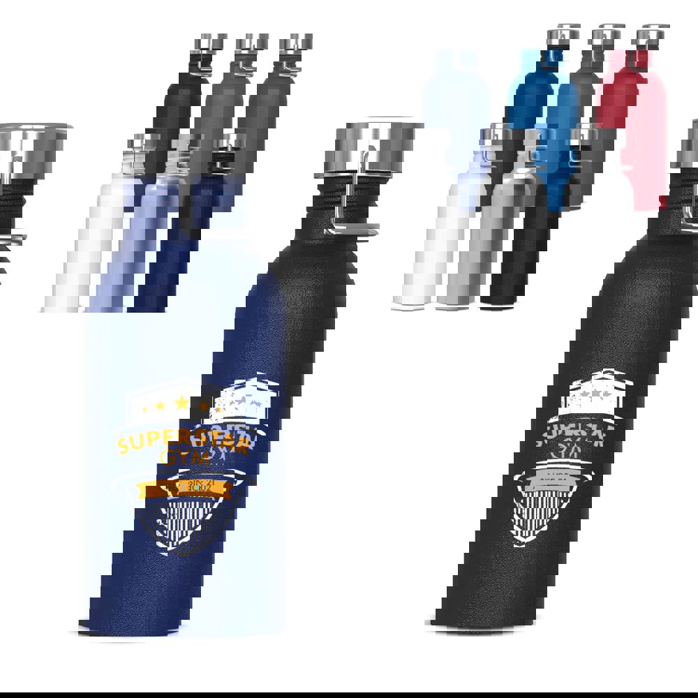 Roestvrijstalen enkelwandige waterfles. De 100% lekvrije fles wordt geleverd in mooie geschenkverpakking. De fles bevat een poedercoating aan de buitenkant voor een hoogwaardiger oppervlak. Geschikt voor koude niet-koolzuurhoudende dranken.