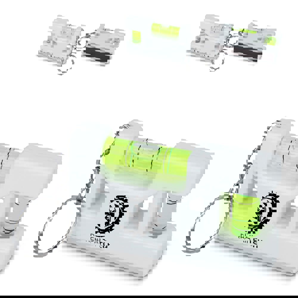 Multifunctionele sleutelhanger met geïntegreerde verticale en horizontale waterpassen, een liniaal van 7 cm en een magneet. Ideaal voor kleine waterpastaken, snelle metingen.