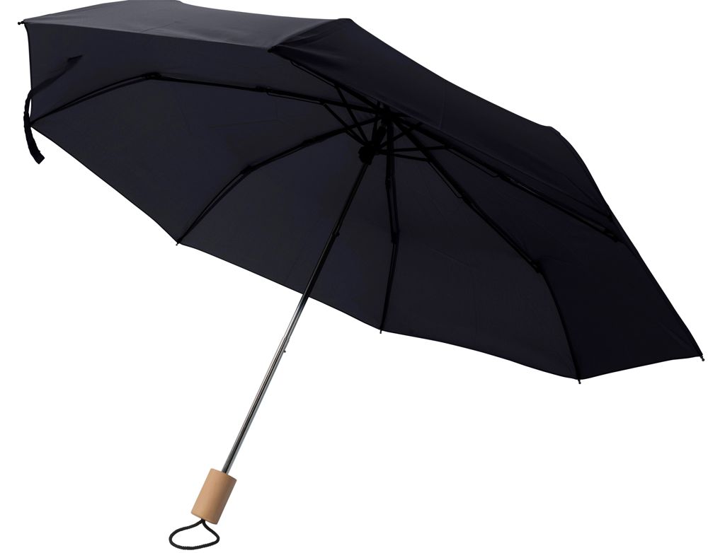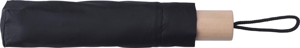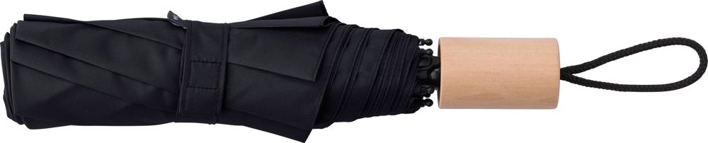 rPET 190T, opvouwbare paraplu met acht panelen en eikenhouten handvat. Inclusief beschermhoes.