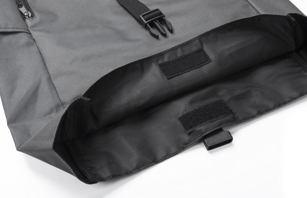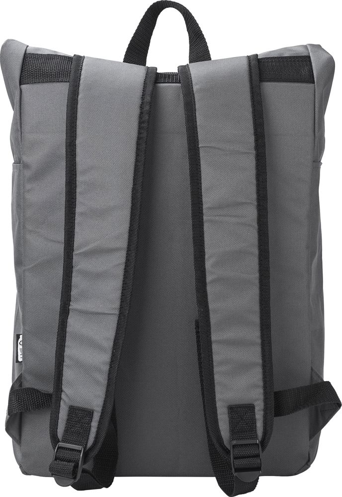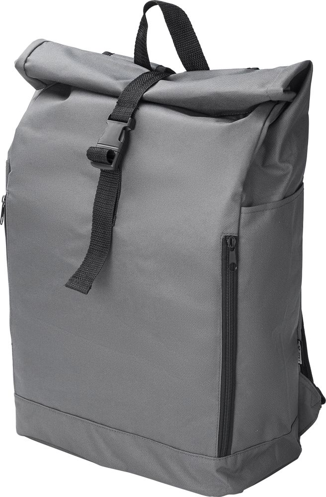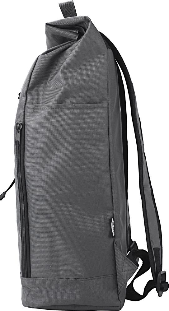 rPET polyester (600D) rugzak met oprolbare bovenkant. Twee ritszakken aan de zijkant. Eén groot compartiment. Klittenbandsluiting en gespsluiting.