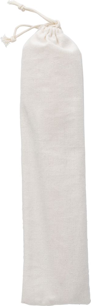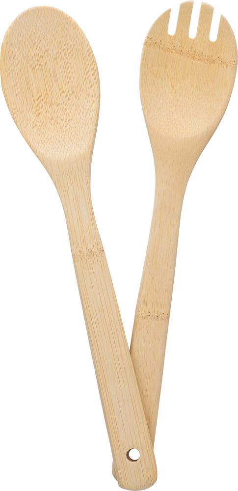 Bamboe saladebestek. Het bestek heeft gaatjes aan het uiteinde van het handvat. Verpakt in een katoenen trekkoordzakje.