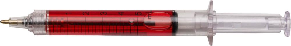 Kunststof balpen, zwartschrijvend, model 'injectiespuit', met gekleurde vloeistof.