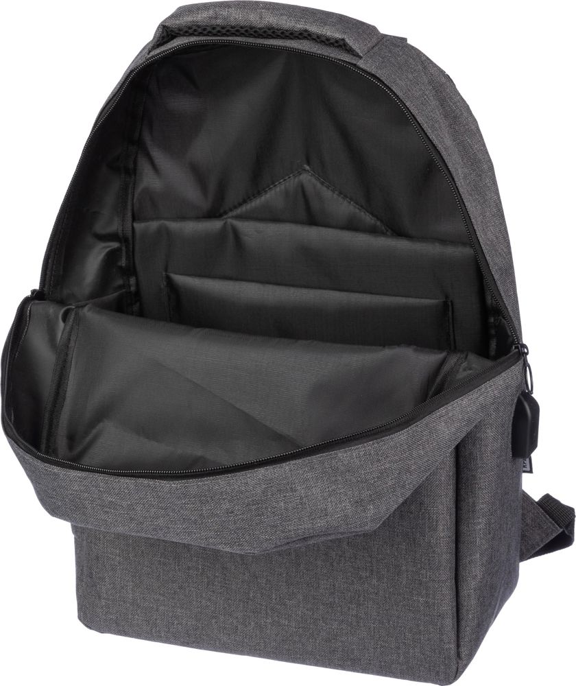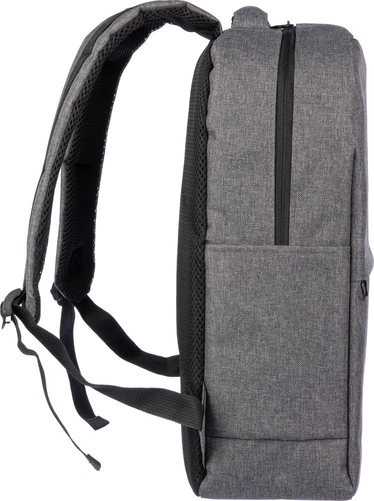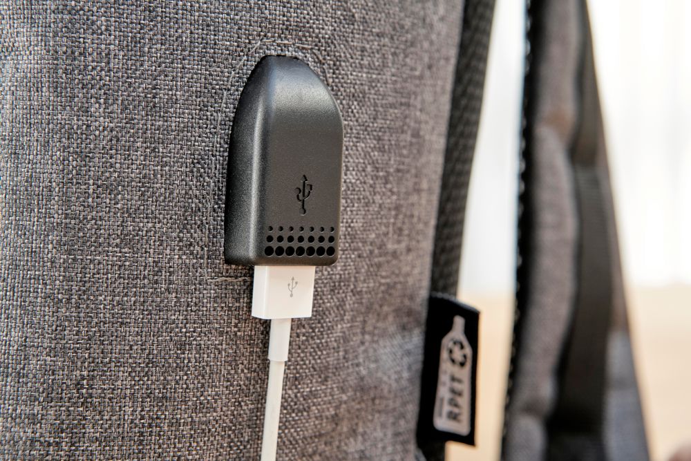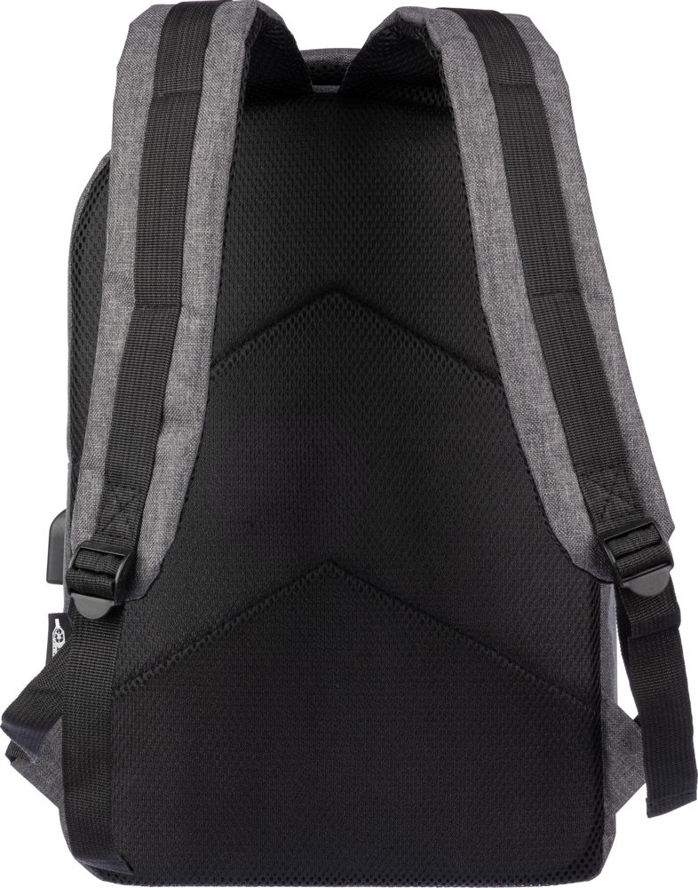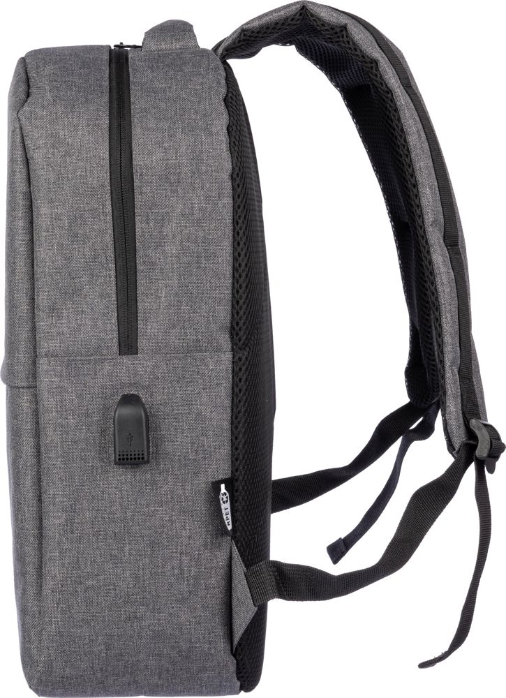 rPET (600D) rugzak met USB-poortopening (en USB-kabel binnenin) met een groot vak met rits aan de bovenkant en een vak met rits aan de voorkant. Binnenin is er een vak voor 10-inch apparaten en één voor 15-inch apparaten. Met verstelbare banden.
