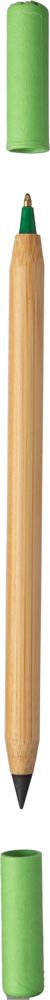 Bamboe balpen en eeuwige potlood. Eén zijde met eeuwige potlood en de andere met balpen, beide met gekleurde kartonnen dop. Blauwe inkt.