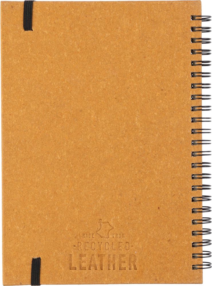 Gerecycled leren notitieboek (ca. A5) met 80 pagina’s (70 gram). Reliëf van gerecycled leer op de achterkant van de kaft.