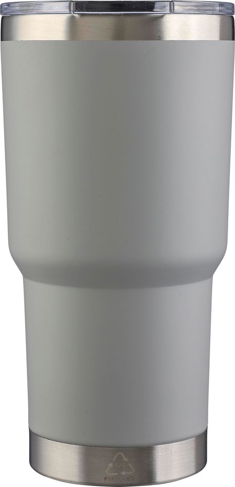 Roestvrijstalen dubbelwandige beker (590 ml) met PS-deksel. Gerecycled logo gegraveerd op de beker. De binnenkant is van roestvrij staal 304 en de buitenkant van roestvrij staal 201. Per stuk verpakt in een bruin kartonnen doos.