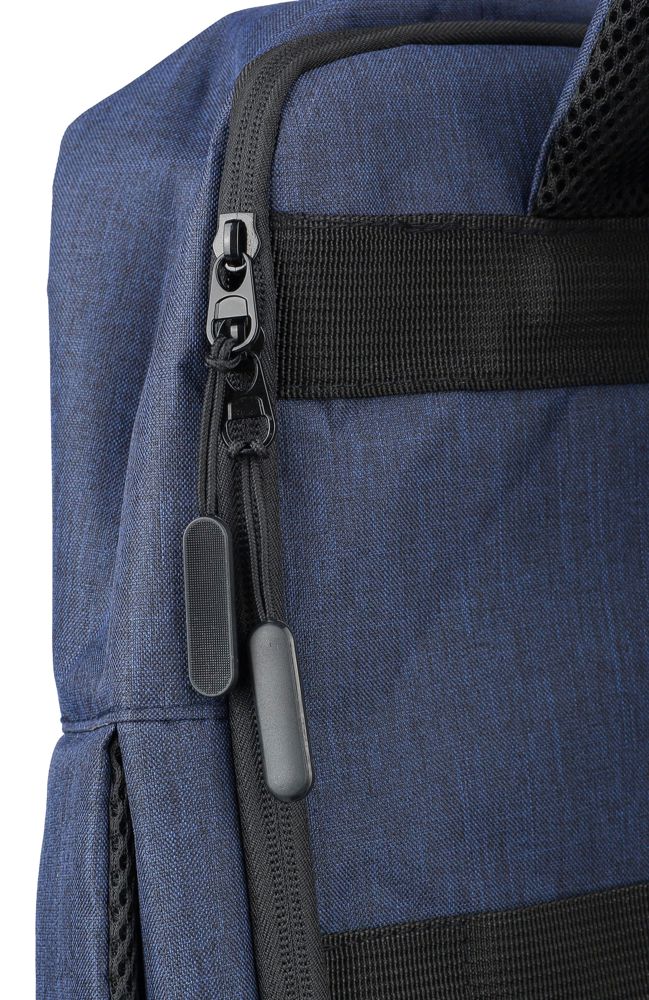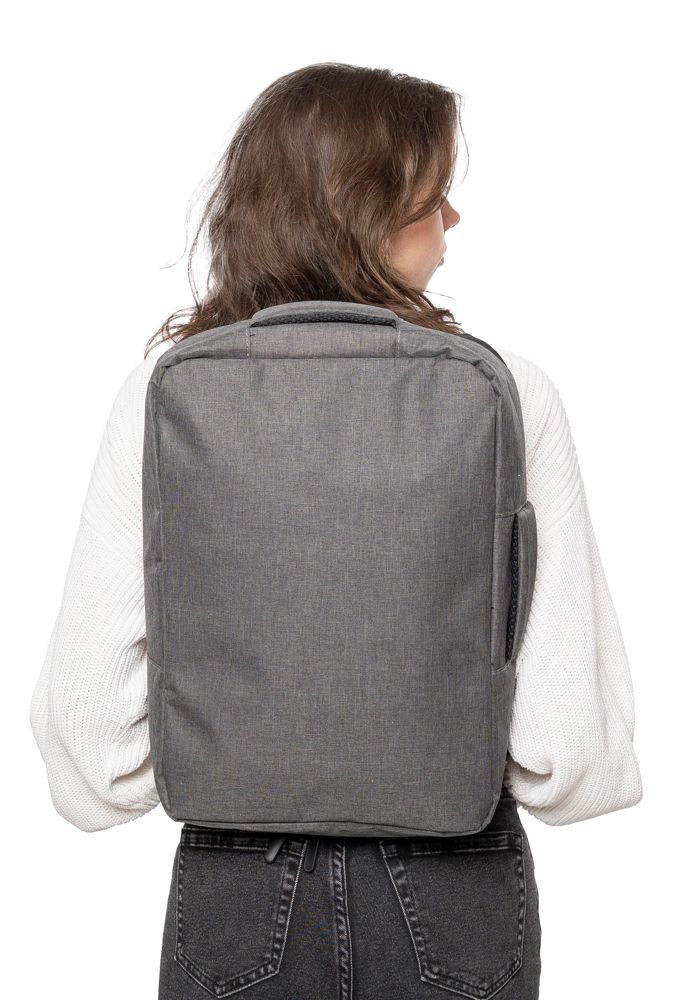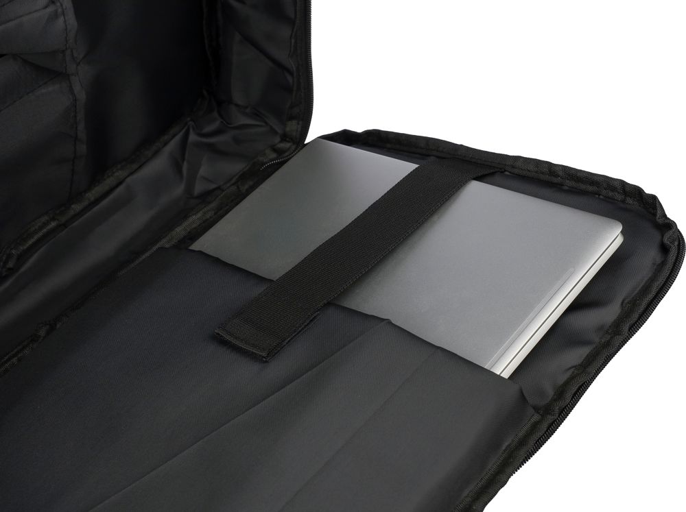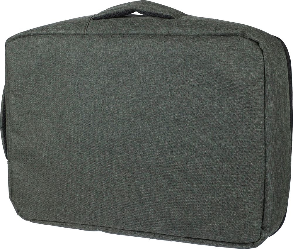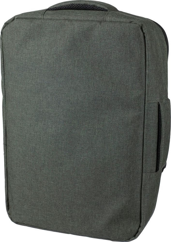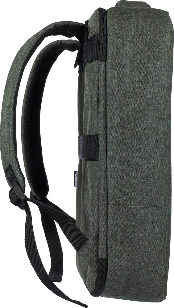 Gerecyclede rPET polyester 300D laptoptas met een 210D rPET-voering. Voorzien van een ruim hoofdvak met ritssluiting en meerdere insteekvakken, een laptopvak met klittenbandsluiting geschikt voor een 15-inch laptop, en een capaciteit van 12L. Het ontwerp bevat een verstevigde, geventileerde rug, verstelbare schouderbanden, een zijhandgreep en een trolleyband. Draagvermogen: 10 kg.