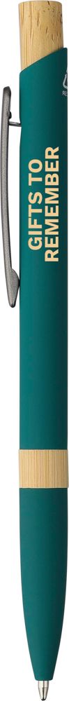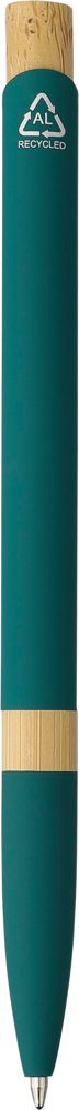 Gerecyclede aluminium balpen met een rubberen afwerking, bamboe drukknop en bamboe ring in de penhouder. Voorzien van een drukmechanisme, een 1,0 mm schrijfpunt en blauwe inkt met een schrijfafstand van ongeveer 800 meter. Inclusief een gegraveerd logo van gerecycled aluminium.