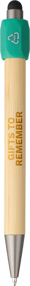 Bamboe balpen met spinnerfunctie, gemaakt van gerecycled ABS, en voorzien van een zwarte styluspunt op de drukknop. Uitgerust met een drukmechanisme, een 1,0 mm schrijfpunt en blauwe inkt met een schrijfafstand van ongeveer 800 meter. Inclusief een logo van gerecycled ABS.