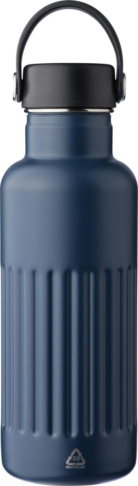 Gerecyclede roestvrijstalen dubbelwandige drinkfles (500 ml). De binnenzijde is van roestvrij staal 304 en de buitenzijde van roestvrij staal 201 met een geribbeld gripontwerp. Voorzien van een PP- en ijzeren dop met een TPE-handvat voor eenvoudig dragen. Inclusief gerecycled roestvrijstalen logo aan de voorkant. Individueel verpakt in een bruine kartonnen doos.