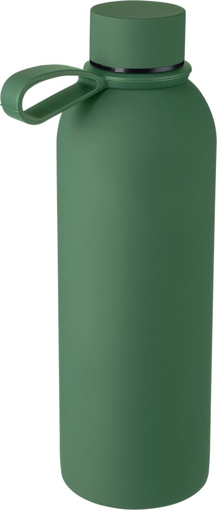 Gerecycled roestvrijstalen dubbelwandige vacuüm drinkfles (500 ml) met een binnenzijde van roestvrij staal 304 en een buitenzijde van roestvrij staal 201. Afgewerkt met een rubberen coating voor een zachte grip. Voorzien van een schroefdeksel van PP met metalen detail en een siliconen draaglus. Inclusief gerecycled roestvrijstalen logo aan de voorkant. Individueel verpakt in een bruine kartonnen doos.
