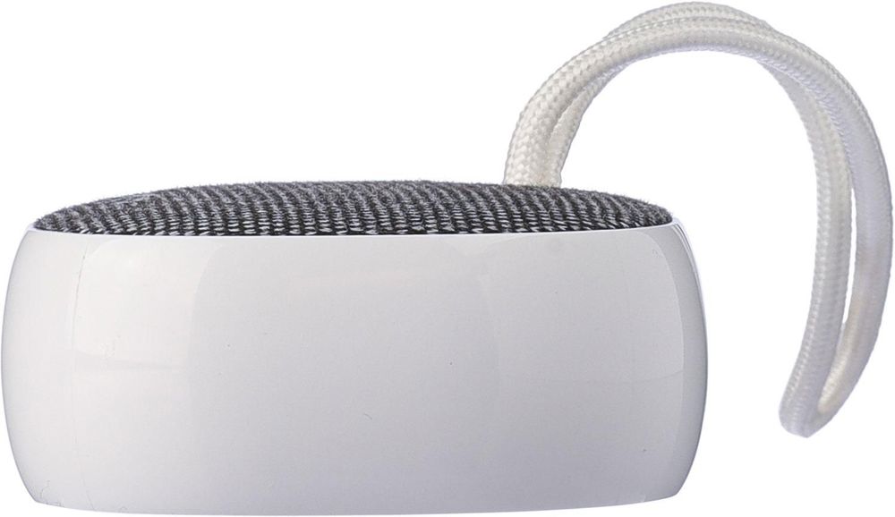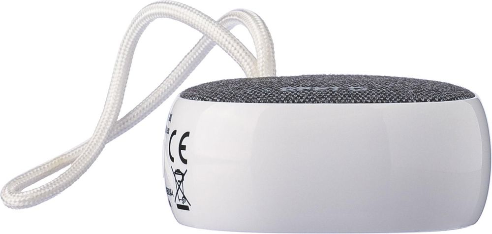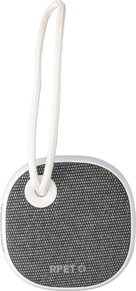 Gerecycled ABS en rPET-stof draadloze speaker met klein nylon draagkoord. Batterijcapaciteit 300 mAh met 3W output, draadloze technologie versie 5.3 en een bereik van 10 meter. Oplaadtijd ca. 2 uur, met een afspeeltijd van 23 uur. Inclusief witte USB-C oplaadkabel van 30 cm. Voorzien van rPET-logo op de stof en gerecycled ABS-logo op de zijkant. Individueel verpakt in een bruine kartonnen doos.