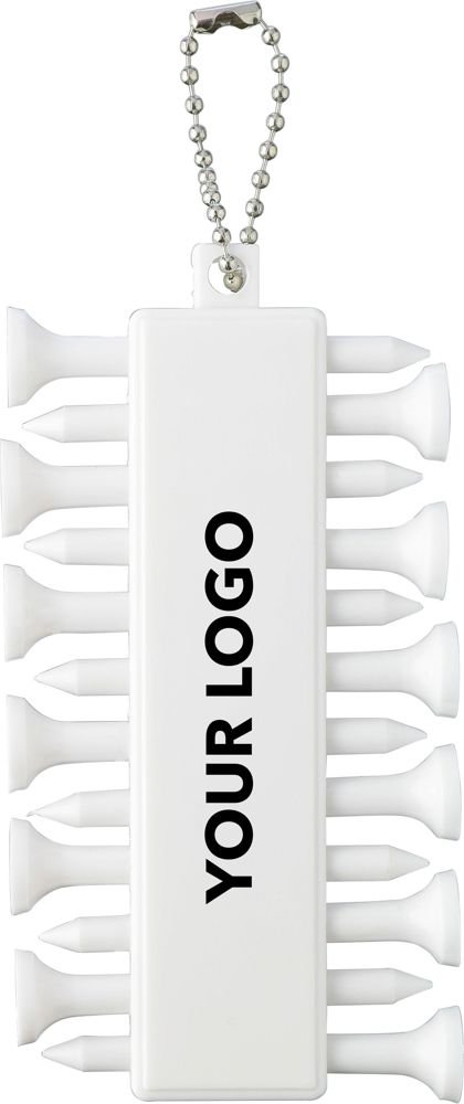 Gerecycled ABS golf tee-set bestaande uit 12 tees in een compacte houder met drie markers aan de achterzijde. Voorzien van een metalen koord voor eenvoudige bevestiging en het gerecycled ABS-logo op de achterkant.