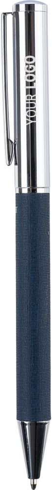 Messing en rPET draaibalpen met metalen clip en grip. Voorzien van draaimechanisme en rPET-logo op het lichaam. Individueel verpakt in een bruine kartonnen doos. Blauwe inkt.