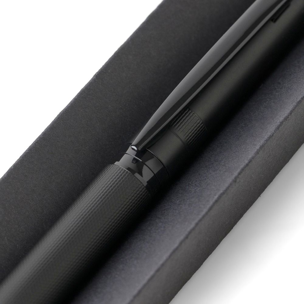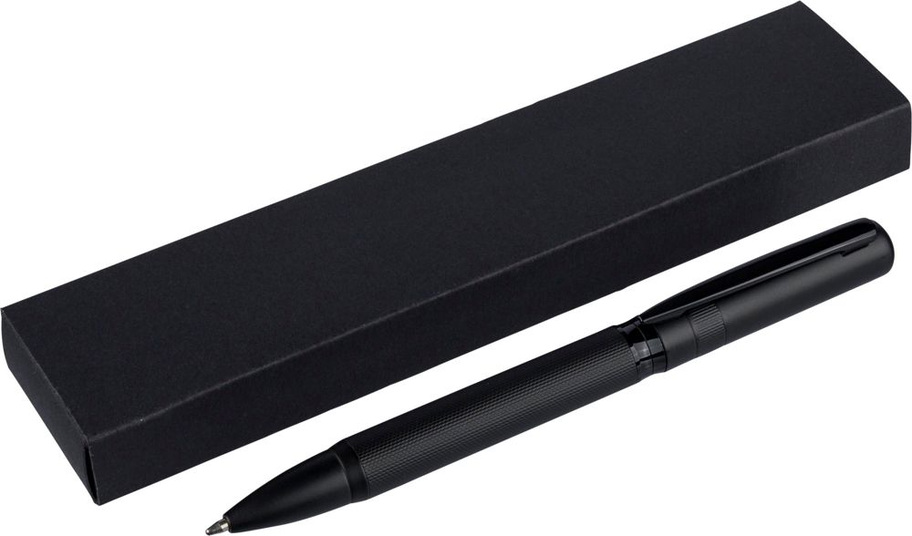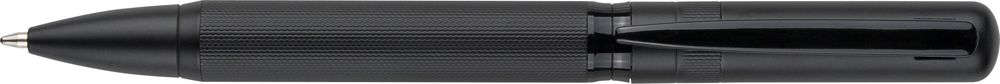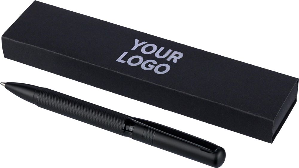 Ecobrass balpen met draaimechanisme en kleurgecoördineerde metalen clip. Voorzien van blauw schrijvende Duitse Dokumental-inkt met een schrijfduur van ongeveer 1.000 meter. Individueel verpakt in een zwarte schuifdoos.
