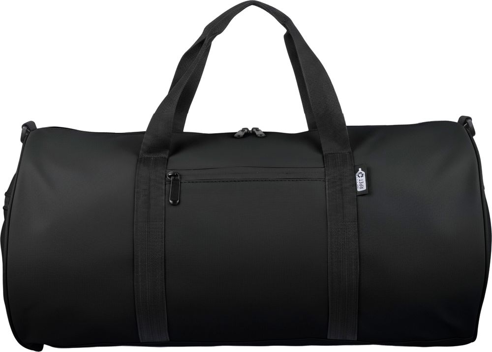 rPET sporttas gemaakt van 600D polyester met 210D voering en waterafstotende PU-coating. Voorzien van een groot hoofdvak met ritssluiting, klein voorvak met ritssluiting voor decoratie, een extra klein zijvak met ritssluiting en een zijvak van mesh. Uitgerust met twee handvatten en een verstelbare schouderriem. Inhoud 40 liter. Inclusief rPET-label aan de buitenzijde.