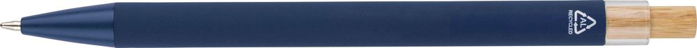 Balpen van gerecycled aluminium met bamboe drukknop en AS-kunststof detail. Voorzien van metalen clip en kunststof punt, beide in bijpassende kleuren. Lasergegraveerd gerecycled logo op het houdertje. Geschatte schrijflengte van 800 meter. Blauwe inkt.