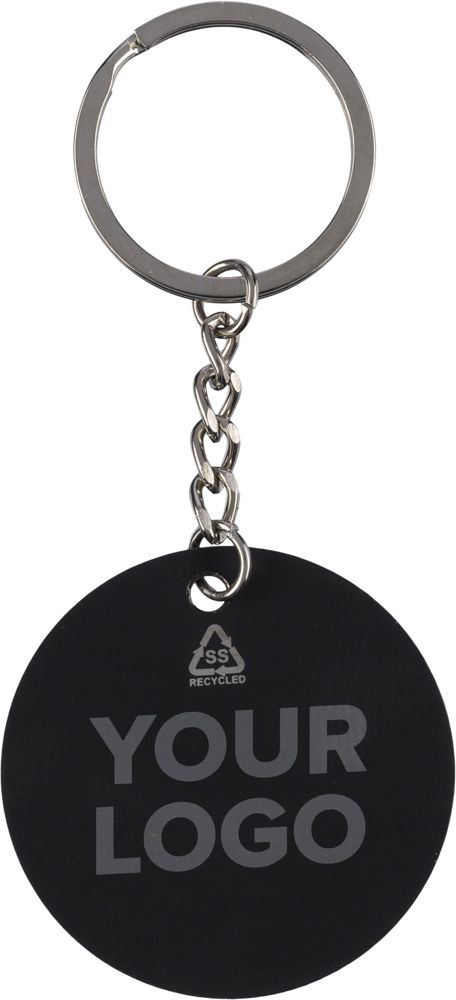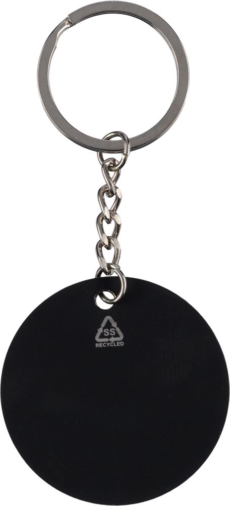 Gerecycleerde roestvrijstalen rubberen sleutelhanger met metalen ring in een ronde voetbalvorm. Voorzien van een gegraveerd gerecycled logo dat na gravering een glanzend spiegeleffect onthult. Per stuk verpakt in een kraftpapieren envelop.