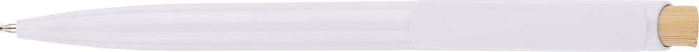 Gerecycleerde ABS balpen met bamboe drukknop en witte clip, geschikt voor digitale bedrukking. Voorzien van een gerecycled logo in het in-mould. Geschatte schrijflengte van 600 meter. Blauwe inkt.