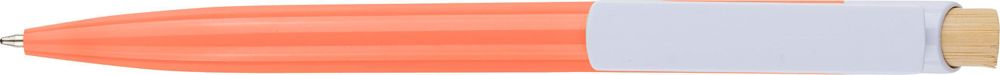 Gerecycleerde ABS balpen met bamboe drukknop en witte clip, geschikt voor digitale bedrukking. Voorzien van een gerecycled logo in het in-mould. Geschatte schrijflengte van 600 meter. Blauwe inkt.