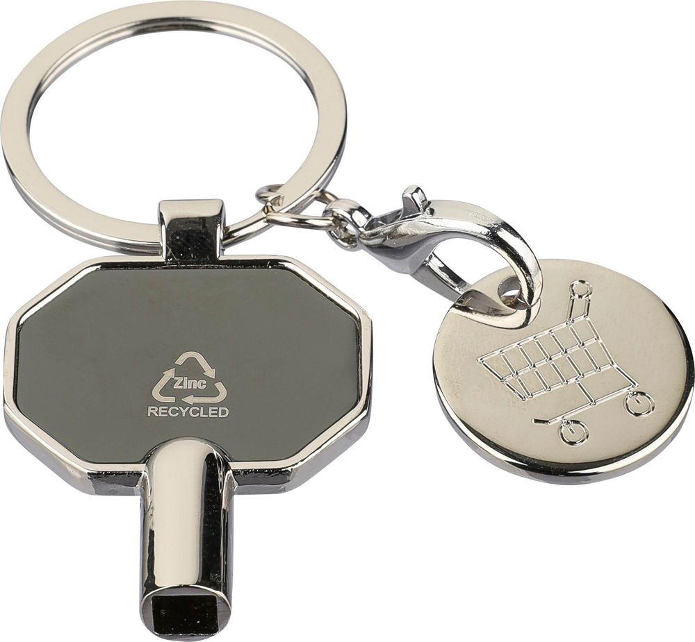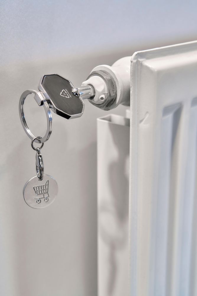Sleutelhanger van gerecycled zinklegering met radiatorsleutel en winkelmunt. Voorzien van een vierkante sleutel van 5 x 5 mm, de meest gebruikte maat in Europa om radiatoren te ontluchten. Geleverd met stevige metalen sleutelring en gerecycled logo. Individueel verpakt in een bruine kartonnen envelop met illustratie.