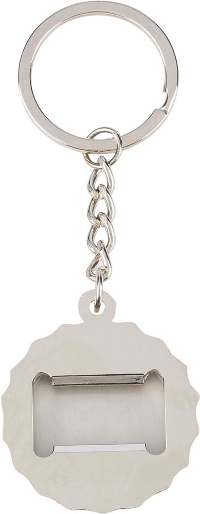 Sleutelhanger van zinklegering met bamboe-inleg aan de voorkant en geïntegreerde flesopener aan de achterkant. Voorzien van een metalen sleutelring en verpakt in een papieren zakje.