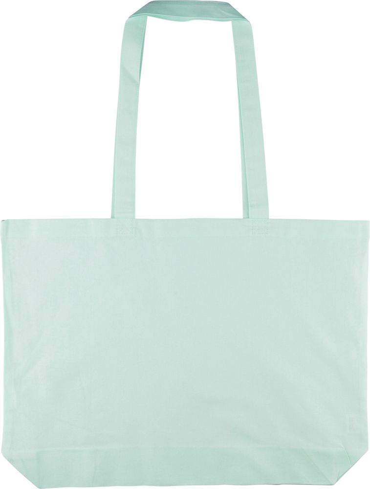 Oeko-Tex® katoen (14?g/m²) boodschappentas met een bodemvouw van 10?cm en lange hengsels (70?cm lang, 2,5?cm breed). Pastelkleurig katoen in PMS 9562U (groen), 162U (oranje), 317U (blauw) en 522U (paars). Voorzien van een Oeko-Tex® label.