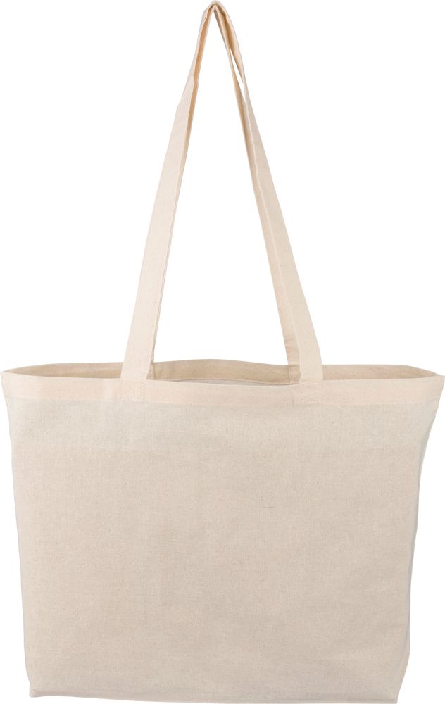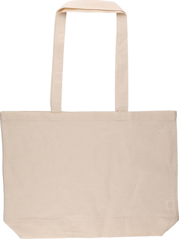 Oeko-Tex® katoen (14?g/m²) boodschappentas in natuurlijke kleur. Afmeting 48?×?34?×?10?cm met 70?cm lange hengsels (2,5?cm breed). Voorzien van een Oeko-Tex® label.
