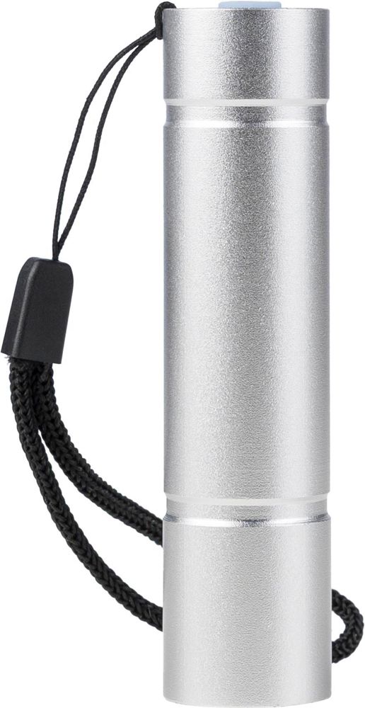 COB-zaklamp van gerecycled aluminium (80–100 lumen) met 3 lichtstanden (voorzijde, zijkant, knipper). Voorzien van drukknop, polskoord van polyester en gegraveerd recyclelogo. Oplaadbaar via USB-C (300?mAh batterij), inclusief zwart oplaadsnoer van 30?cm. Verpakt in een bruine kartonnen doos met illustratie.