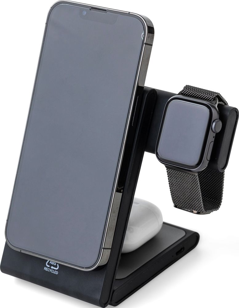 Gerecycleerd ABS 3-in-1 magnetisch draadloos oplaadstation voor smartphone, smartwatch en oordopjes. Ultraplat ontwerp met opvouwbare telefoonstandaard. Oplaadvermogens: Telefoon 15W, AirPods 5W, iWatch 2W. Ingang: 5V/3A of 9V/3A, uitgang: tot 9V/1,67A. Voorzien van een gerecycled logo. Individueel verpakt in een bruine kartonnen doos.