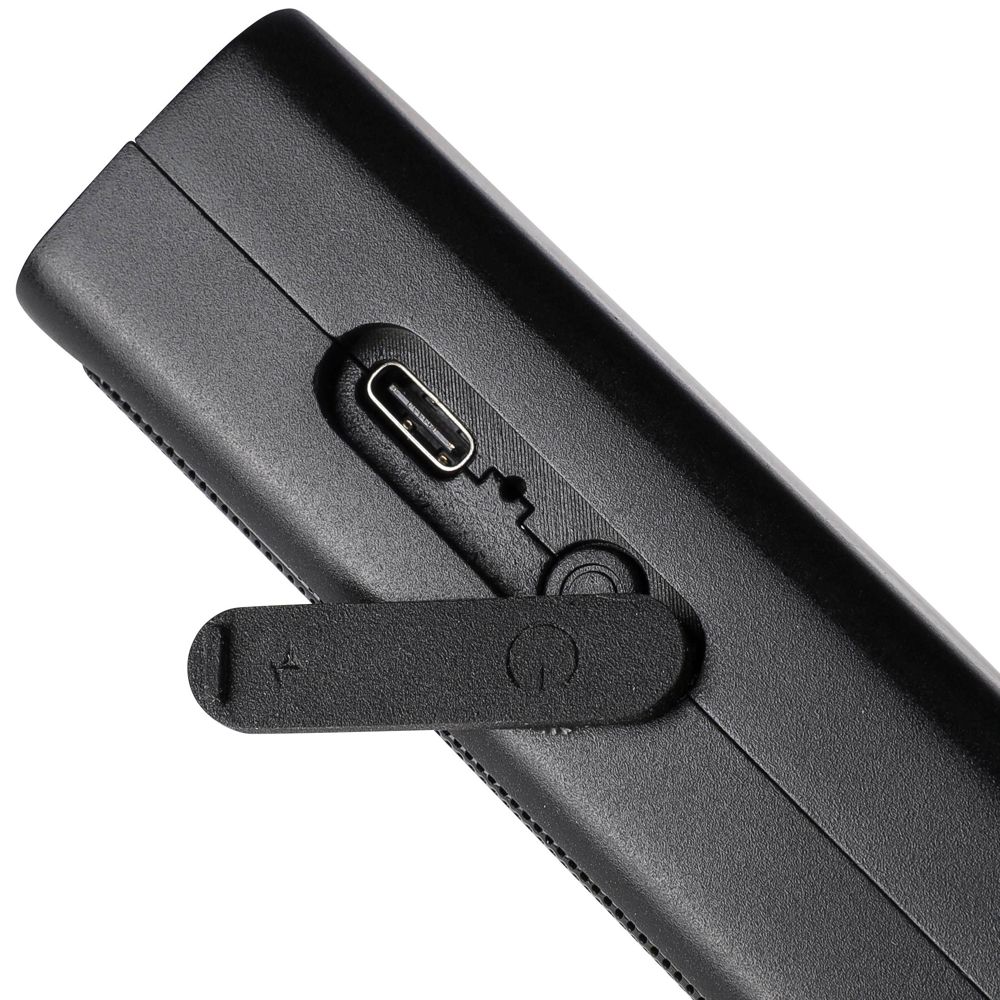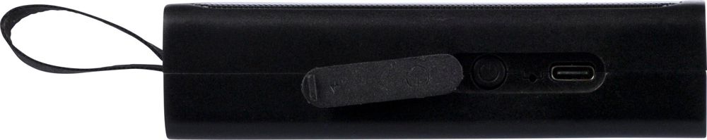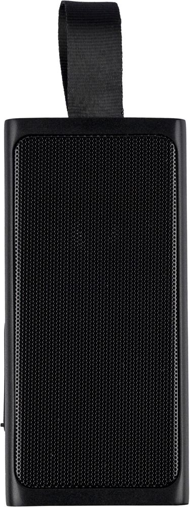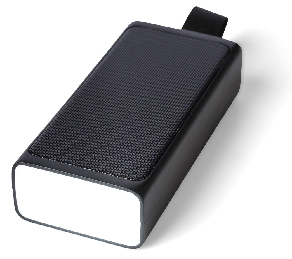 Recycled ABS draagbare speaker (5W) met metalen rooster en geïntegreerde COB LED-zaklamp. Voorzien van siliconen draaglus, draadloze verbindingstechnologie 5.4 en een 500?mAh batterij. Input: 5V/500?mA. Ontworpen voor buitengebruik. Inclusief recycled-logo.