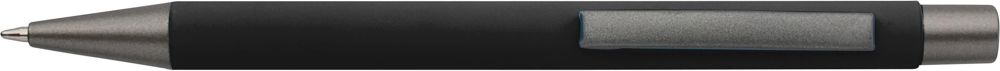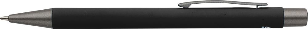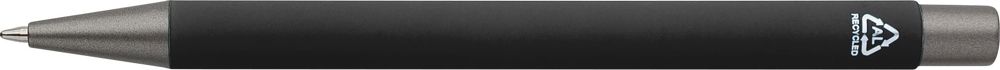 Recyclede aluminium balpen met een zachte rubberen afwerking en blauwe schrijfinkt. Ontworpen met donkergrijze accenten en een spiegelende onderlaag die zorgt voor een opvallend gegraveerd resultaat. Voorzien van een drukmechanisme en afgewerkt met een gegraveerd gerecycled logo.