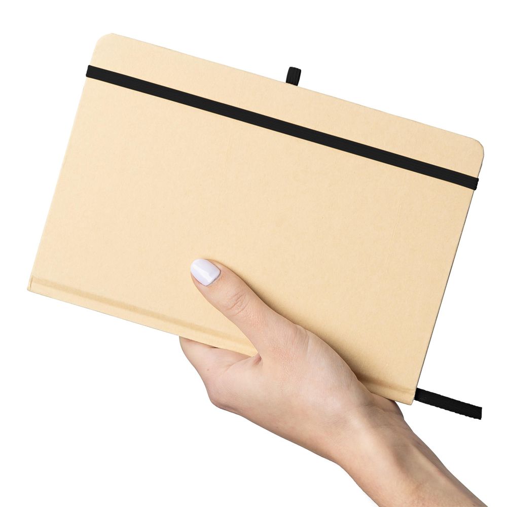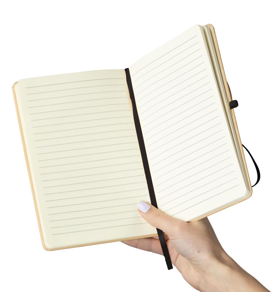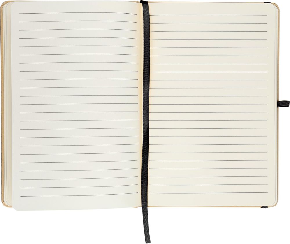 A5-notitieboekje met kraft hardcover en aluminiumfolie aan de achterkant, ontworpen voor lasergravure met een spiegeleffect dat na het graveren verschijnt. Bevat 80 gelinieerde pagina's van 70 g/m² papier voor soepel schrijven. Het papier in dit notitieboekje is FSC® Mix-gecertificeerd. Afgewerkt met bijpassende kleuraccenten, waaronder een elastische band, leeslint en pennenlus.