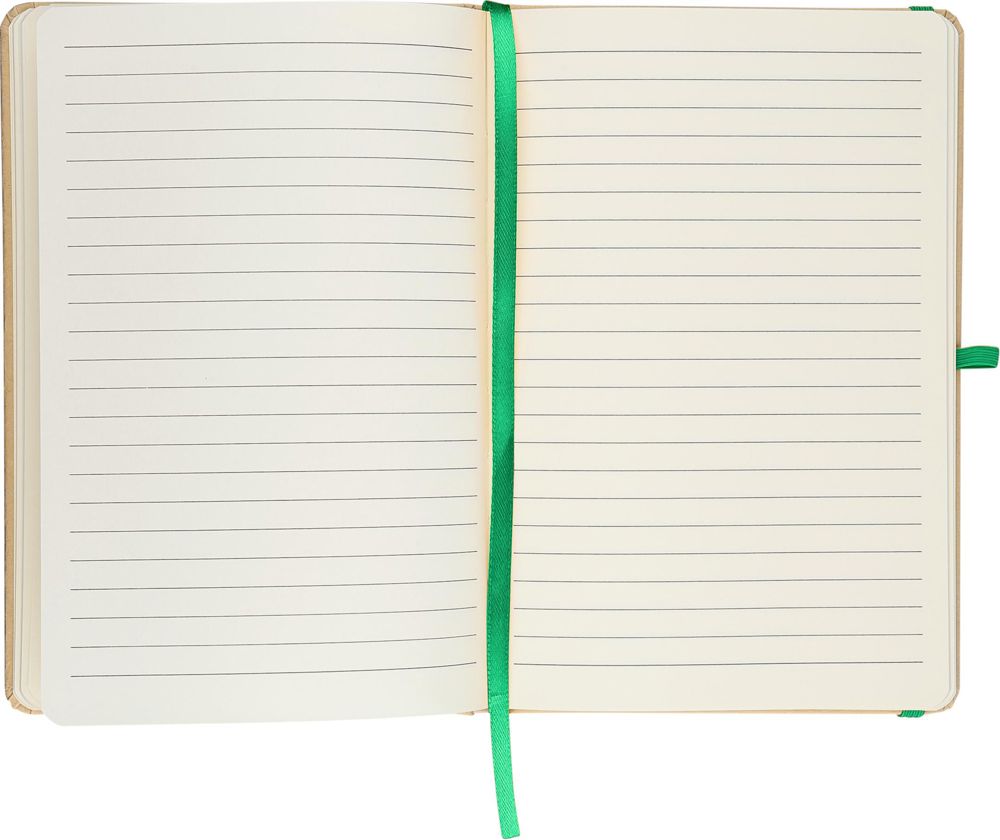 A5-notitieboekje met kraft hardcover en aluminiumfolie aan de achterkant, ontworpen voor lasergravure met een spiegeleffect dat na het graveren verschijnt. Bevat 80 gelinieerde pagina's van 70 g/m² papier voor soepel schrijven. Het papier in dit notitieboekje is FSC® Mix-gecertificeerd. Afgewerkt met bijpassende kleuraccenten, waaronder een elastische band, leeslint en pennenlus.