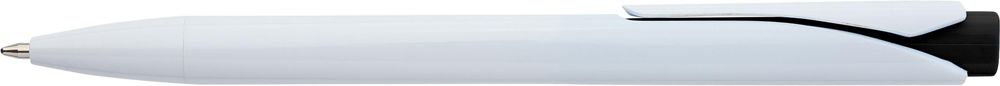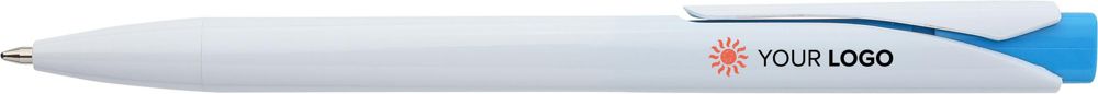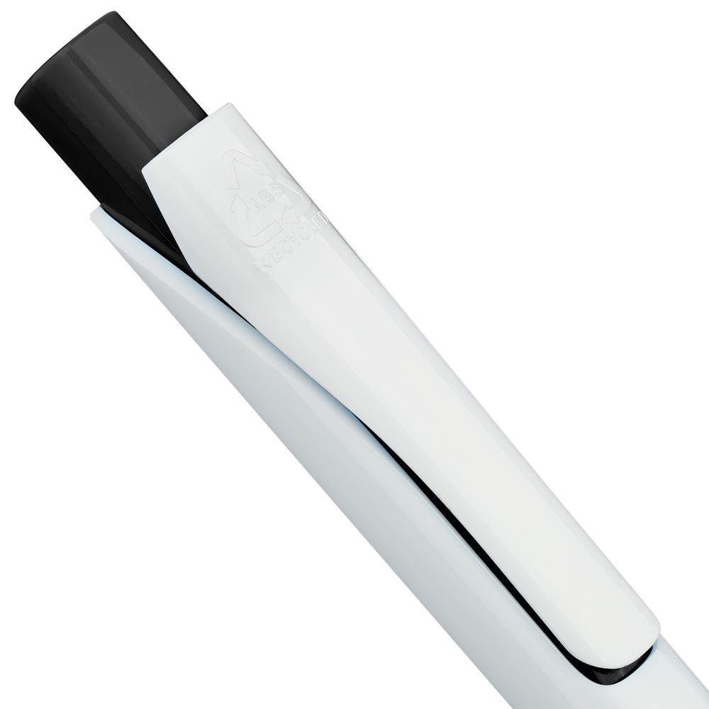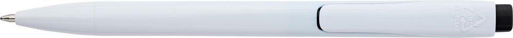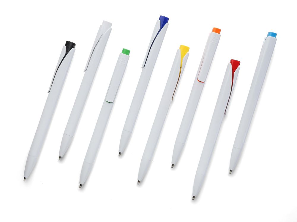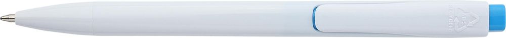 Balpen met effen witte behuizing en gekleurd drukknopdetail. Gemaakt van gerecycled ABS, waardoor plastic afval wordt verminderd en tegelijkertijd een stootvastheid en lange levensduur wordt behouden. Voorzien van een drukknopmechanisme, clip en in-mould gerecycled ABS-logo bovenop de drukknop. Voorzien van blauwe Duitse Dokumental-inkt, waarmee ongeveer 800 meter kan worden geschreven.