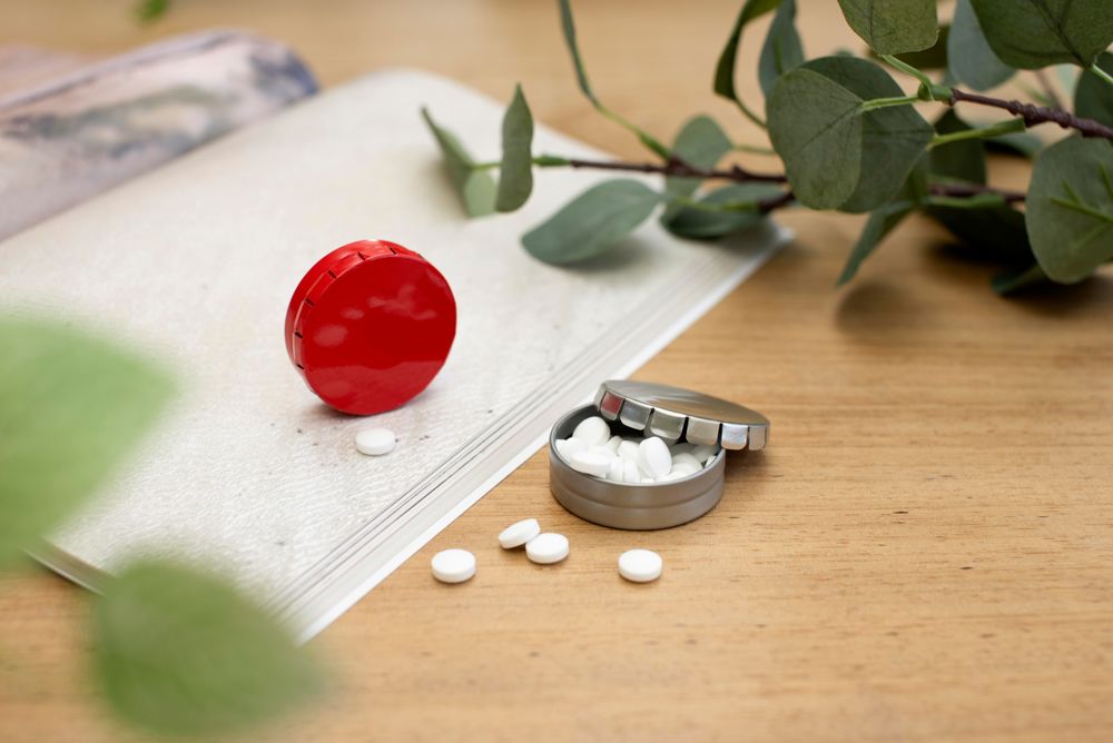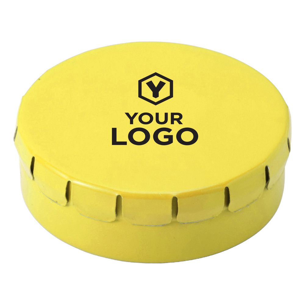 Metalen snoepblikje met 'click-clack' deksel, met ca. 40 suikervrije mintjes.