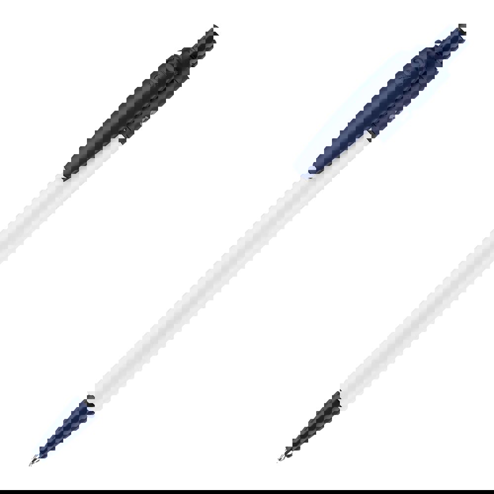 Stilolinea kunststof balpen, blauwschrijvend, met een witte tip en gekleurde brede clip. Inclusief jumbo vulling. Voorzien van Duitse Dokumental-inkt.