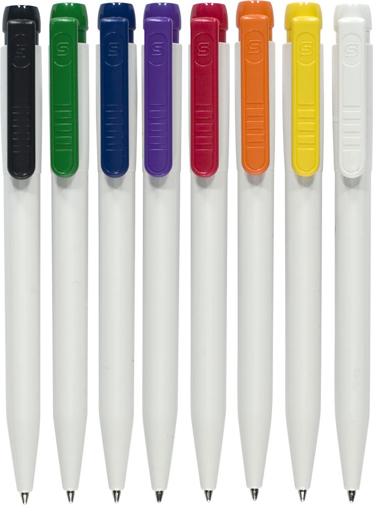 Stilolinea kunststof balpen, blauwschrijvend, met een witte tip en gekleurde brede clip. Inclusief jumbo vulling. Voorzien van Duitse Dokumental-inkt.