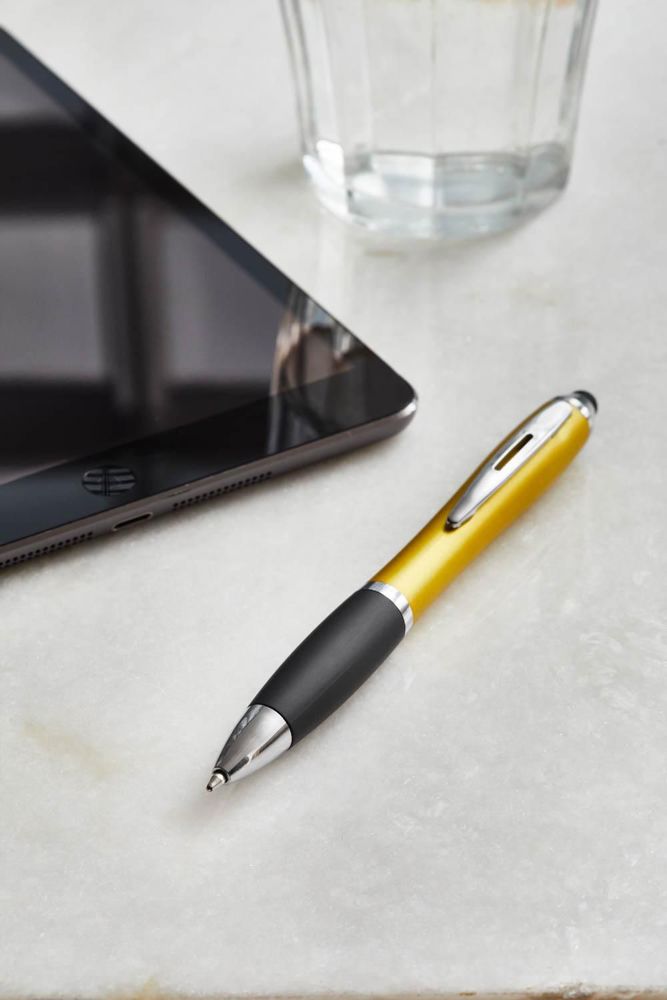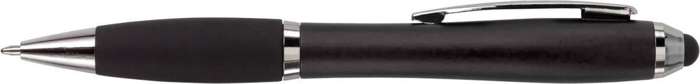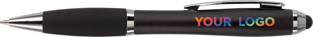 Multifunctionele kunststof balpen, zwartschrijvend, met zwart rubberen grip en gekleurde houder. Ook te gebruiken als capacitieve pen voor uw 'touch screen' schermen.