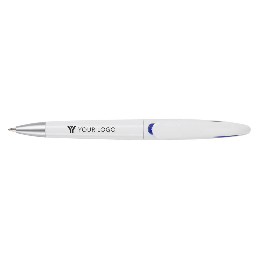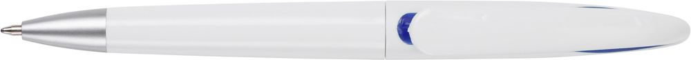 Kunststof balpen met gekleurde elementen, zwartschrijvend, met de clip in de vorm van een zwanenhals. Geregistreerd artikel.