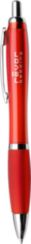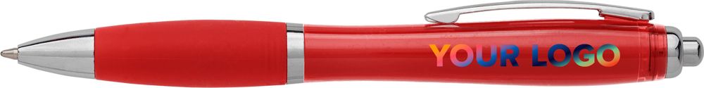 Kunststof transparante balpen, blauwschrijvend, met gekleurde rubberen grip en metalen clip.