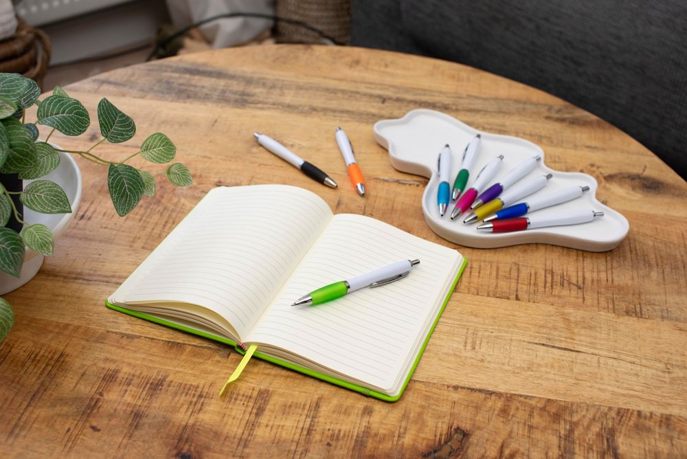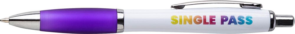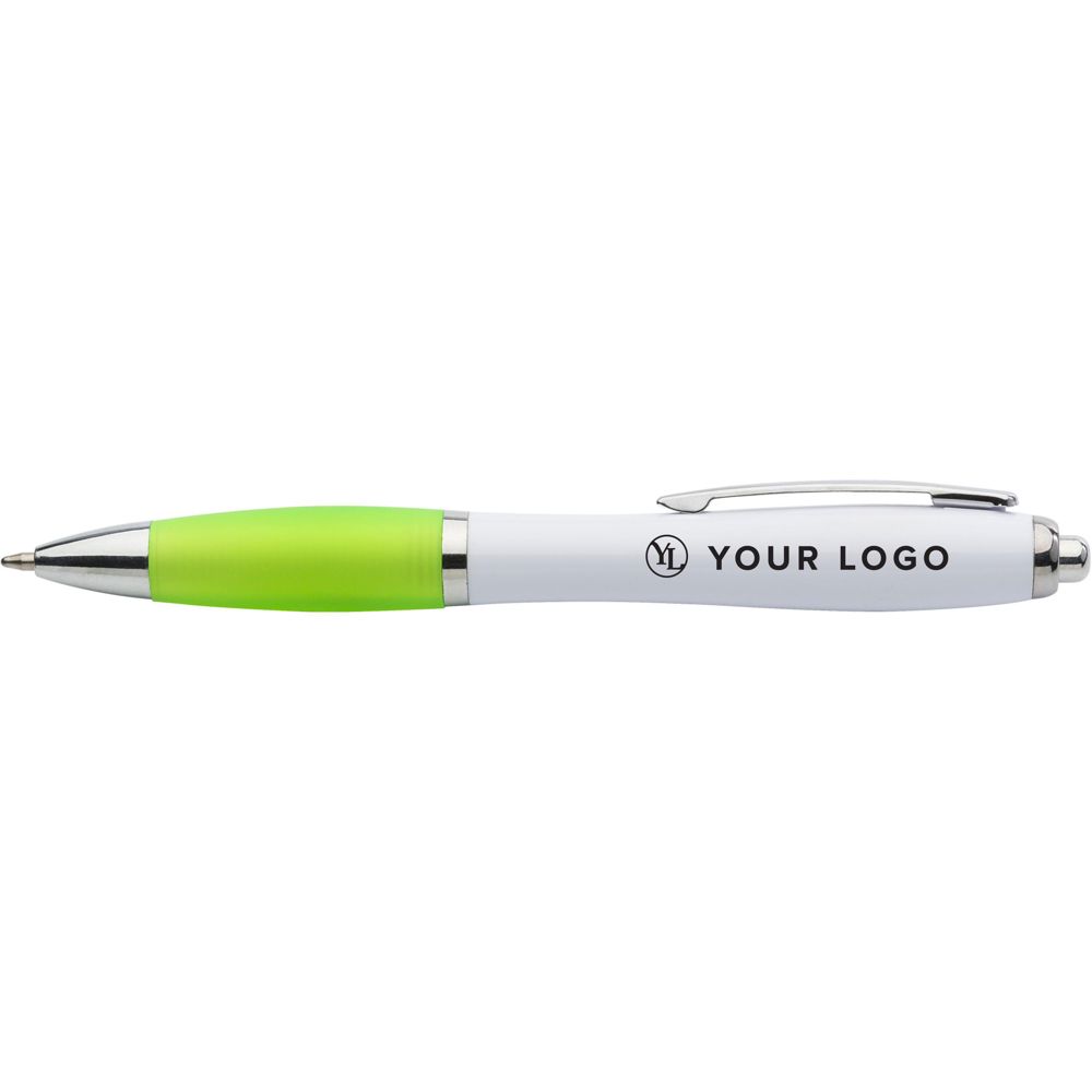 Kunststof balpen, blauwschrijvend, met gekleurde rubberen grip en metalen clip.